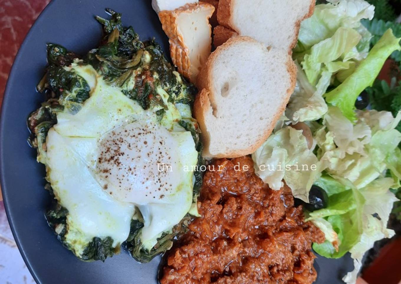 Assiette composée épinards aux œufs,bolognaise, salade, fromage