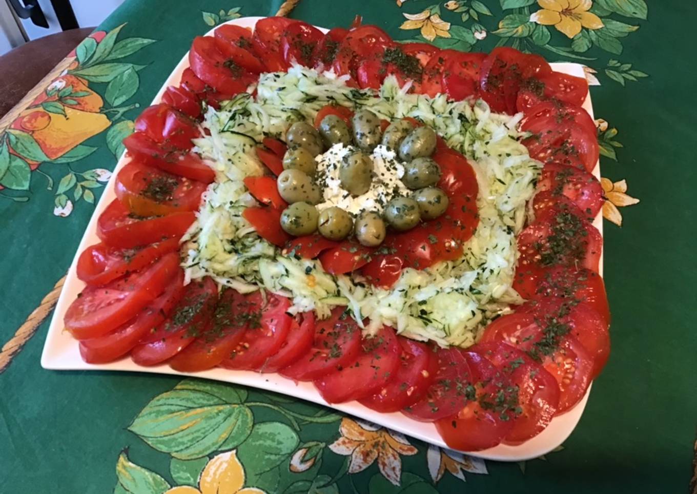 Salade de tomates, courgette, olives, fêta et persil