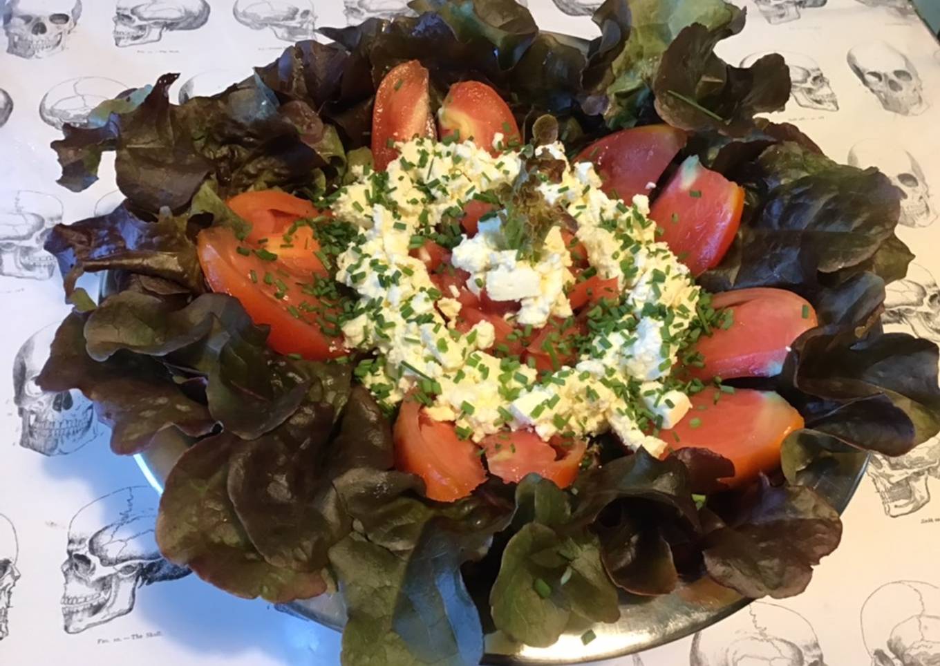 Salade du jardin,tomate cœur de bœuf,fromage frais mariné et ciboulette