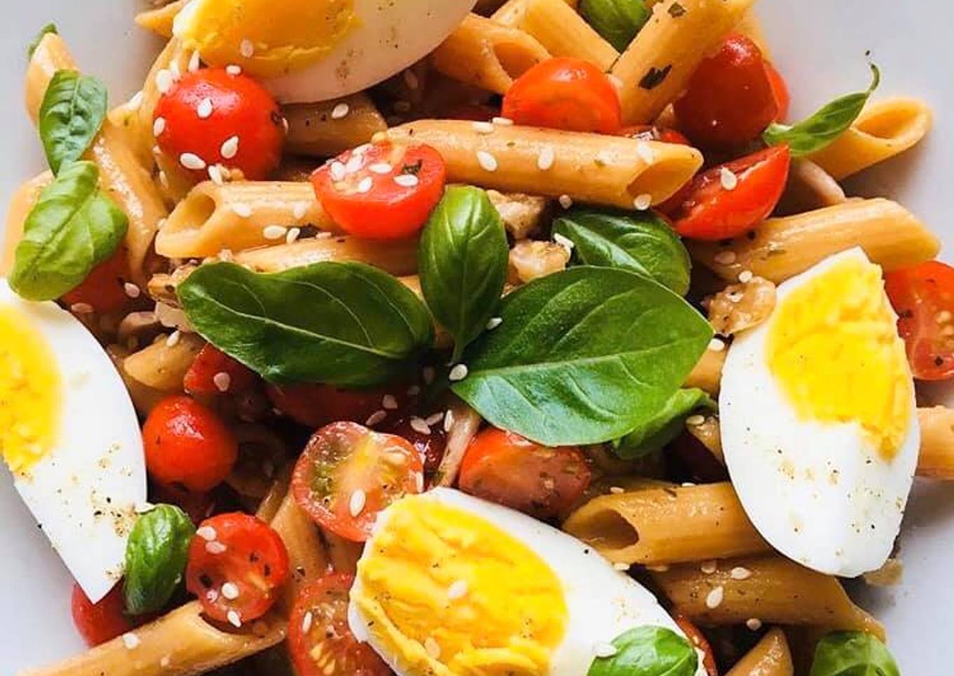 - Servez la salade de Pennes dans des assiettes creuses, déposez les quartiers d’œuf, décorez avec les feuilles de basilic, saupoudrez de graines de sésame, donnez un dernier tour de poivre moulin et ajoutez une pincée de fleur de sel.