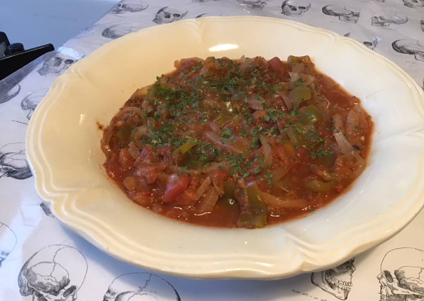 Oignons de roscoff aux tomates,poivron vert,épices et origan